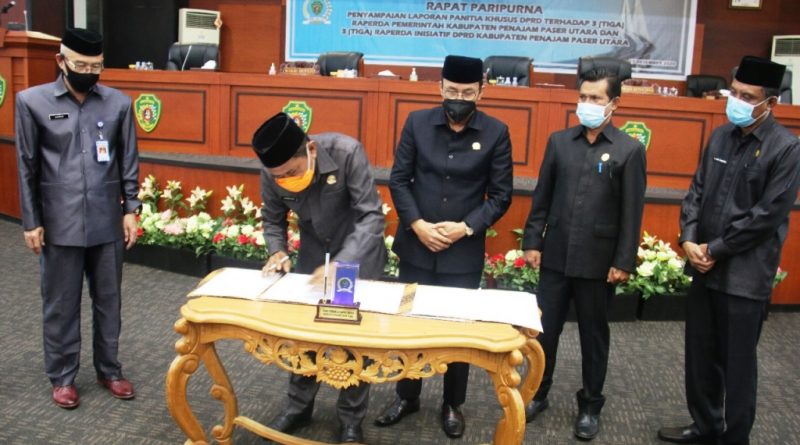 PENAJAM (NK) – Lima Rancangan Peraturan Daerah (Raperda) terdiri dari tiga Raperda usulan Pemerintah Daerah dan dua Raperda inisiatif DPRD Kabupaten Penajam Paser Utara (PPU) disetujui menjadi Peraturan Daerah (Perda). Sementara satu Raperda tentang pengelolaan bongkar muat barang dan jasa di Pelabuhan Benuo Taka yang merupakan inisiatif DPRD ini tidak dilanjutkan karena merupakan kewenangan Pemerintah pusat dan Provinsi.