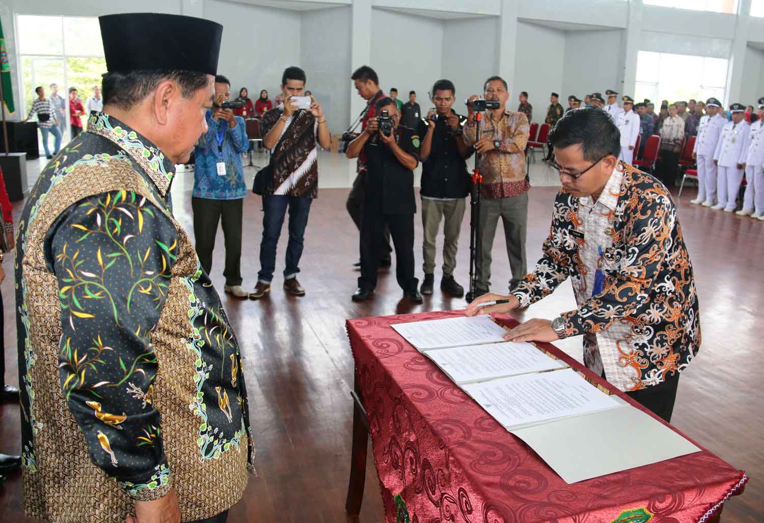 Bupati PPU Yusran Aspar dan Sekretaris Daerah PPU Tohar saat melakukan penandatanganan pakta integritas dalam acara pelantikan serentak di Gedung Graha Pemuda PPU