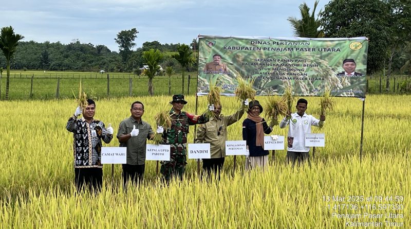 PENAJAM (NK) – Dalam rangka mendukung swasembada pangan di Kabupaten Penajam Paser Utara (PPU) Dinas Pertanian (Distan) Kabupaten PPU bekerjasama dengan Badan standarisasi instrumen pertanian (BSIP) Kementerian Pertanian, Provinsi Kalimantan Timur (Kaltim) mengelar gerakan panen padi yang melibatkan Kelompok Tani (Poktan) Sipatuo, Desa Sesulu, Kecamatan Waru, Kabupaten PPU, Kamis, (13/3/2025).