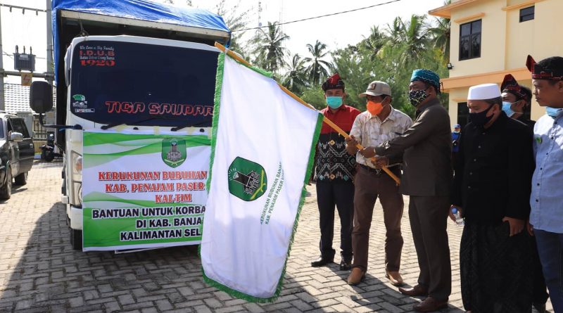 PENAJAM (NK) – Wakil Bupati (Wabup) Kabupaten Penajam Paser Utara (PPU) Ir Hamdam melepas pemberangkatan dua rombongan armada yang menyalurkan bantuan terdampak banjir Provinsi Kalimantan Selatan (Kalsel) di halaman Kantor Camat Waru, Sabtu (23/1/2021). Bantuan tersebut di inisiasi Keluarga Kerukunan Bubuhan Banjar (KKBB) dan Pengurus Cabang Nahdlatul Ulama (PCNU) Kabupaten PPU.