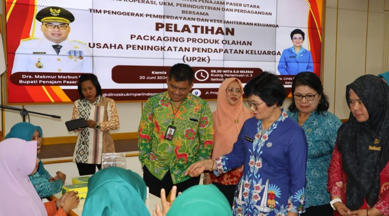 PENAJAM (NK) – Dalam rangka pengembangan dan peningkatan kualitas desain produk olahan, Dinas Perindustrian Perdagangan Koperasi dan Usaha Kecil Menengah (Disperindagkop UKM) Kabupaten Penajam Paser Utara (PPU) menggelar sosialisasi packing produk olahan Usaha Peningkatan Pendapatan Keluarga (UP2K).