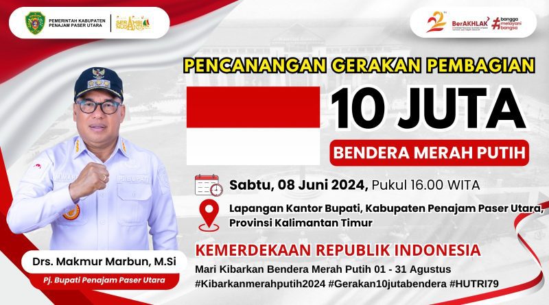 PENAJAM (NK) – Dalam rangka menggugah rasa cinta tanah air dan meningkatkan semangat nasionalisme seluruh masyarakat Indonesia, Pemerintah Kabupaten Penajam Paser Utara (PPU) siap mensukseskan gerakan pembagian 10 juta bendera merah putih tahun 2024, yang akan dilaksanakan mulai 1 Juni sampai dengan 17 Agustus 2024, kegiatan pencanangan awal yang mengambil tempat di Kab.PPU yang rencana akan dihadiri dan dibuka secara resmi oleh Menteri Dalam Negeri (Mendagri) Republik Indonesia (RI).