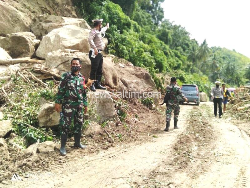 Dibeberkannya, petugas Babinsa Kodim 1401/Majene Koramil 03 Sendana, Sertu Dahlan segera mengoperasikan alat berat untuk pembersihan material longsoran berupa batu besar yang menutup jalan poros Majene – Mamuju.